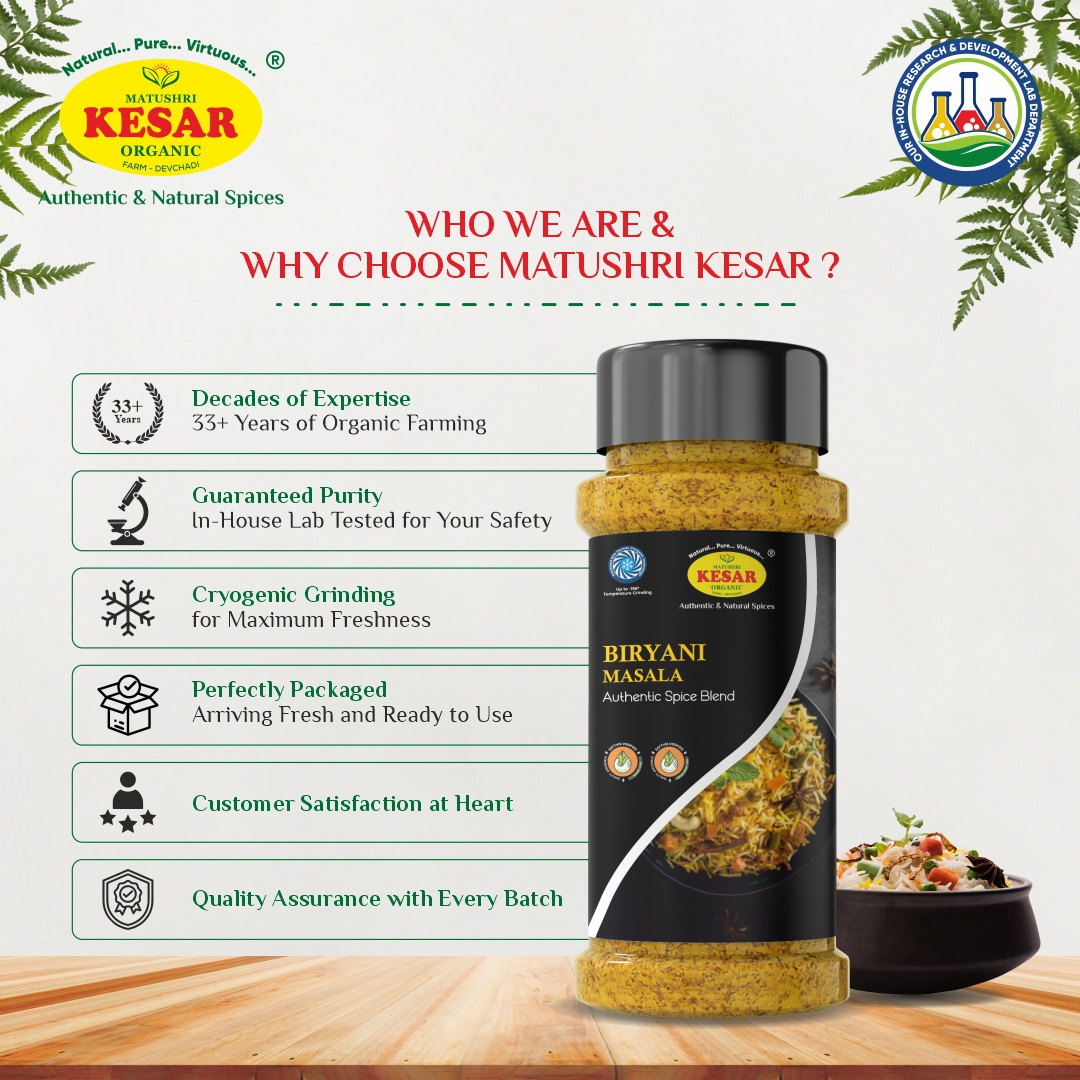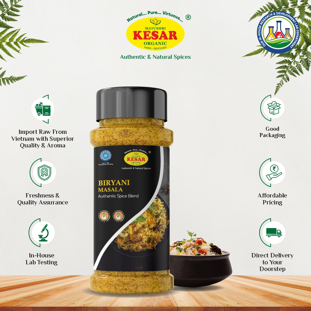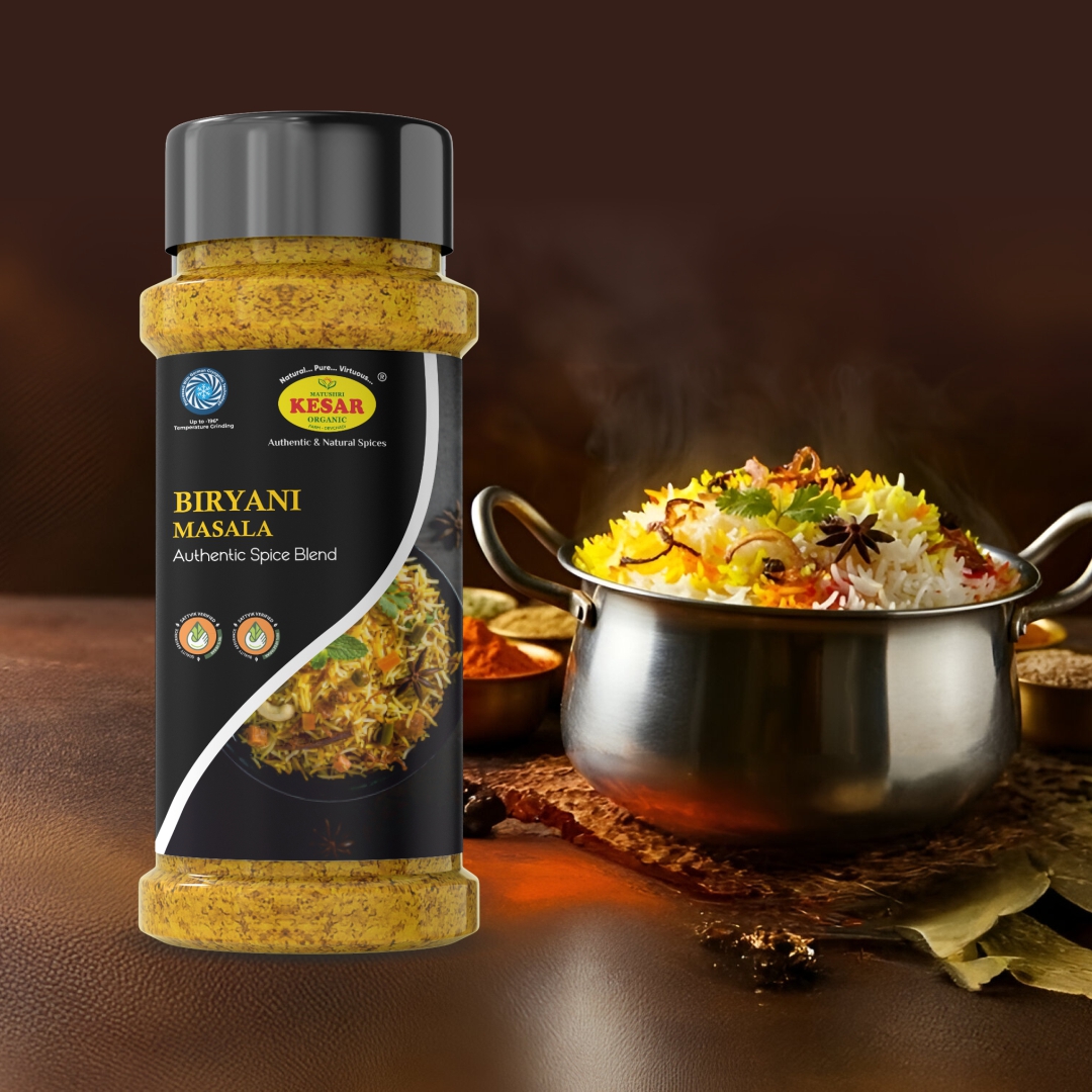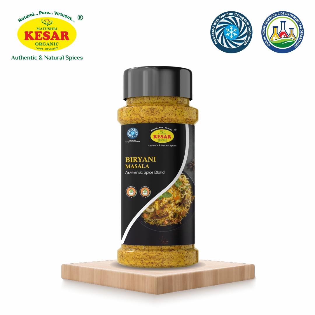 Description: Royal in taste, majestic in aroma—our Biryani Masala transforms any rice dish into a Mughal feast. Made with a complex mix of whole spices like mace, star anise, and cardamom—majority imported from Vietnam—this blend is processed using German Cryogenic Machines to retain essential oils and intensity. Whether it’s Veg, Paneer, or Hyderabadi-style Biryani, this masala guarantees layers of flavor and richness.