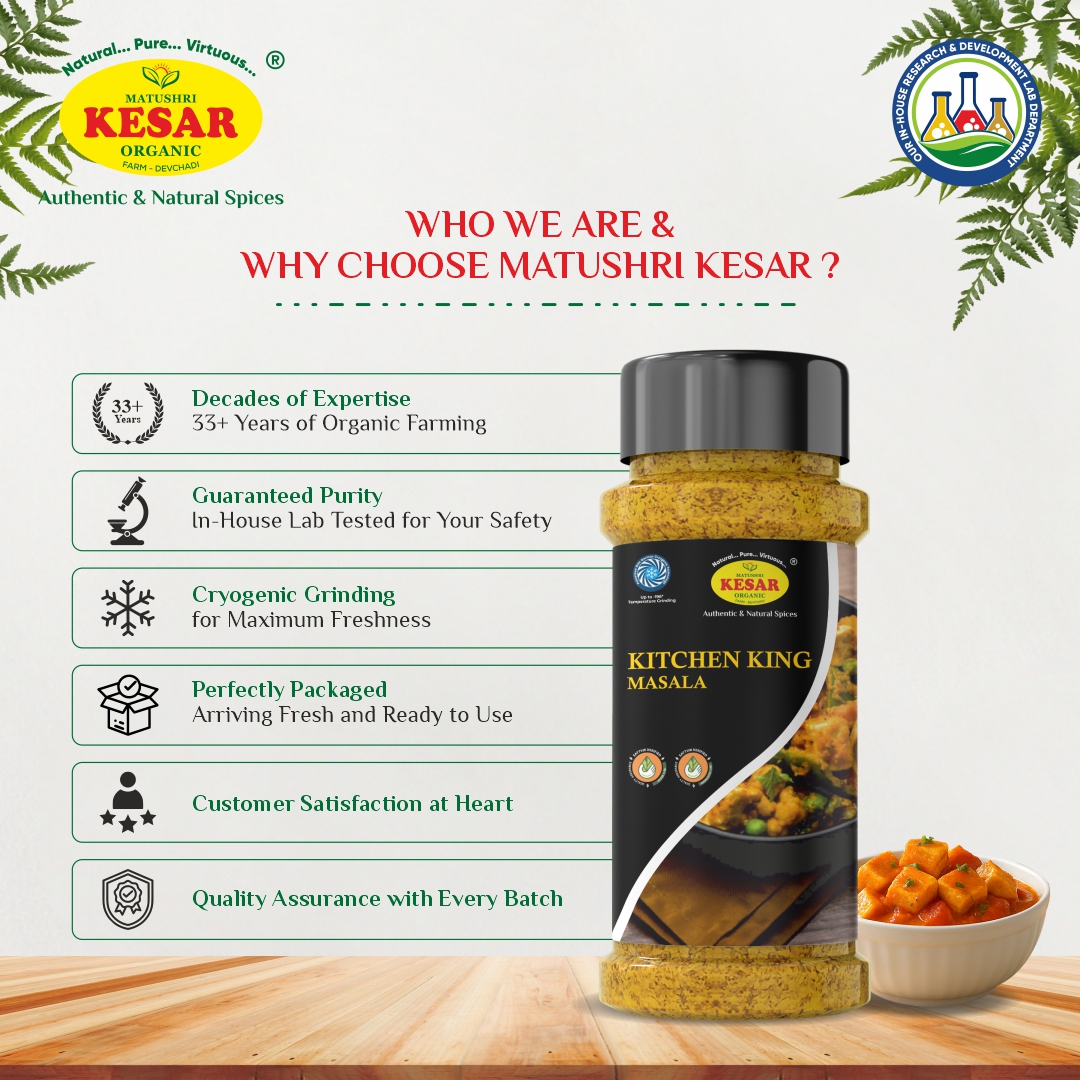 Description: Our Kitchen King Masala is an all-rounder designed to rule your kitchen. A classic blend of high-quality whole spices—majority sourced directly from Vietnam—this masala adds unmatched richness, color, and depth to any Indian preparation, from sabjis to lentils. Cryogenic grinding ensures zero nutrient loss, vibrant flavor retention, and a non-burnt, fresh aroma. A true multipurpose spice that brings consistency and professional taste to home cooking.
