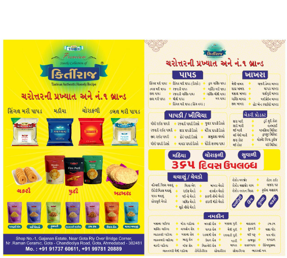 Description: n 1983, Kirtiraj started out with only 5 employees selling one product, papad. In 2018 we now have over 50 different products including 45 different varieties of namkeen, over 8 different flavors of papad, our world famous mathia and chorafali. In the international community, Kirtiraj is known for its high quality, excellent taste and wide variety of products. We currently have 9 retails stores in Gujarat and distribute globally to USA, UK, Canada, Australia, Africa, Kuwait, Germany, Uganda and Fiji. please visit our company website :- https://kirtiraj.com/