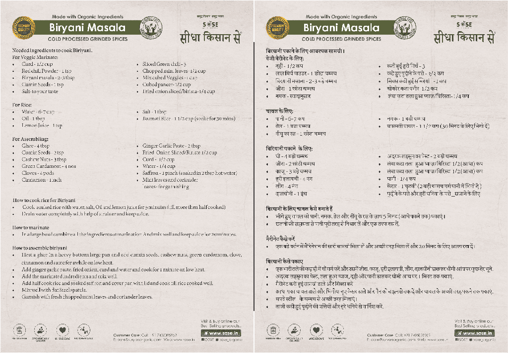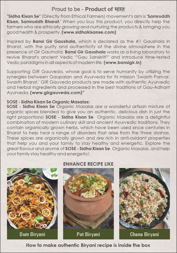 SOSE - Sidha Kisan Se Organic Masalas are a wonderful artisan mixture of organic spices blended to give you an authentic, delicious dish in just the right proportions! SOSE - Sidha Kisan Se Organic Masalas are a delightful combination of modern culinary skill and ancient Ayurvedic traditions. They contain organically grown herbs, which have been used since centuries in Bharat to help heal a range of disorders that arise from the three doshas. These spices are organically grown and are rich in anti-oxidant properties that help you and your family to stay healthy and energetic. Explore the great flavour and arome of SOSE - Sidha Kisan Se Organic Masalas, and help your family stay healthy and energetic!.