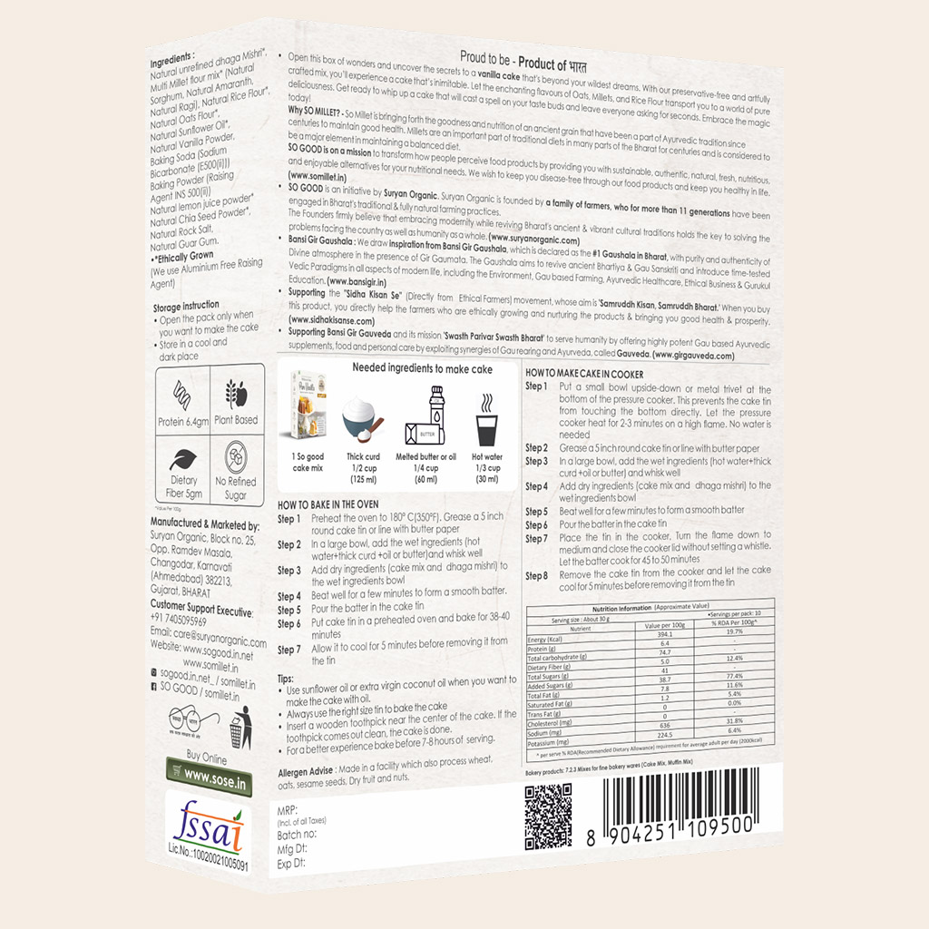 Description: No Artificial Flavours | No Wheat | No Maida | No Preservative Enriched with Millet | Goodness of Oats | Unrefined Dhaga Mishri Open this box of wonders and uncover the secrets to a vanilla cake that's beyond your wildest dreams. With our preservative-free and artfully crafted mix, you're in for a cake experience like no other. Let the enchanting flavours of Oats, Millets, and Rice Flour transport you to a world of pure deliciousness. Get ready to whip up a cake that will cast a spell on your taste buds and leave everyone asking for seconds. Embrace the magic today!