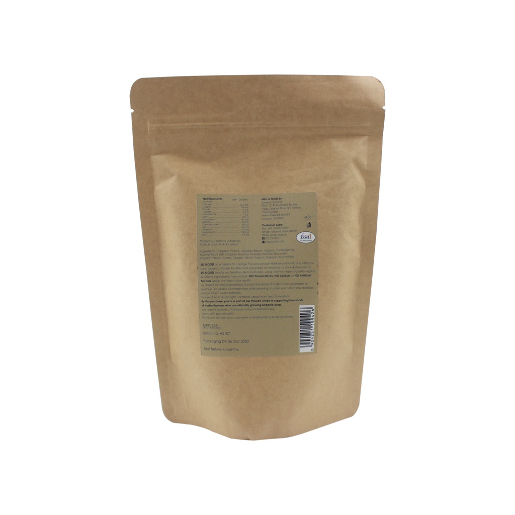 Description: SO GOOD Namkeen is your ‘snack buddy’ of all time! SO GOOD’s wide range of Ethical, Natural, and freshly made snacks is the answer for your creative snacking urges! We have everything to cater to every taste bud. Unlike the practice of using palm oil for frying, we make use of Natural Sunflower Oil for a healthy snacking experience. As a part of Ethical practice, We don’t reuse oil - fresh oil for every batch of Namkeen – the way it’s supposed to be! The finger-licking taste of the So Good Namkeen range uses in-house, natural, preservative-free & taste-enhancer-free seasonings. Not too spicy, not too bland - JUST TOO PERFECT to quench your snack craving!