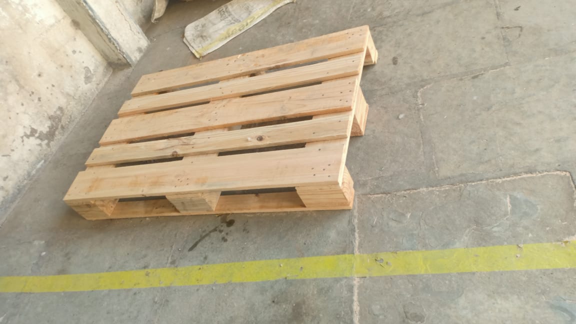 Description: Wooden pallets typically consist of three or four stringers that support several deckboards, on top of which goods are placed.
