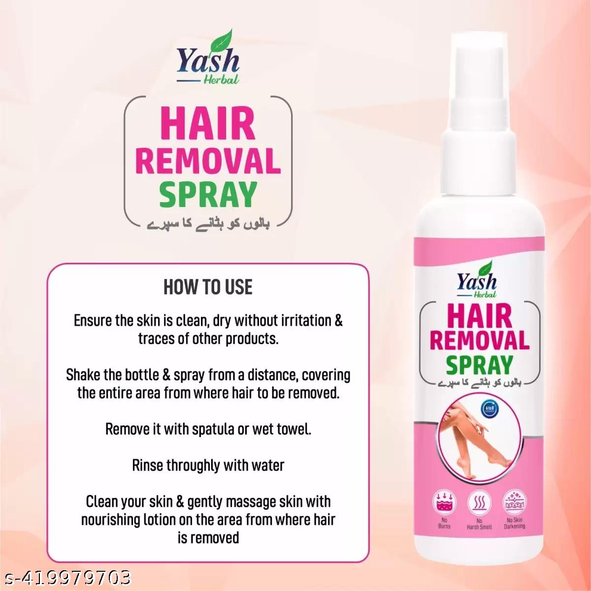 Description: smooth skin with effective hair removal yash hair removal spray for woman No Burns No Harsh Smell No Skin Darkening Yash Herbal Hair Removal Spray is a modern and convenient method of removing hair easily, quickly and gently. Suitable for men and women, it gives you the freedom to just spray and wipe unwanted hair away.