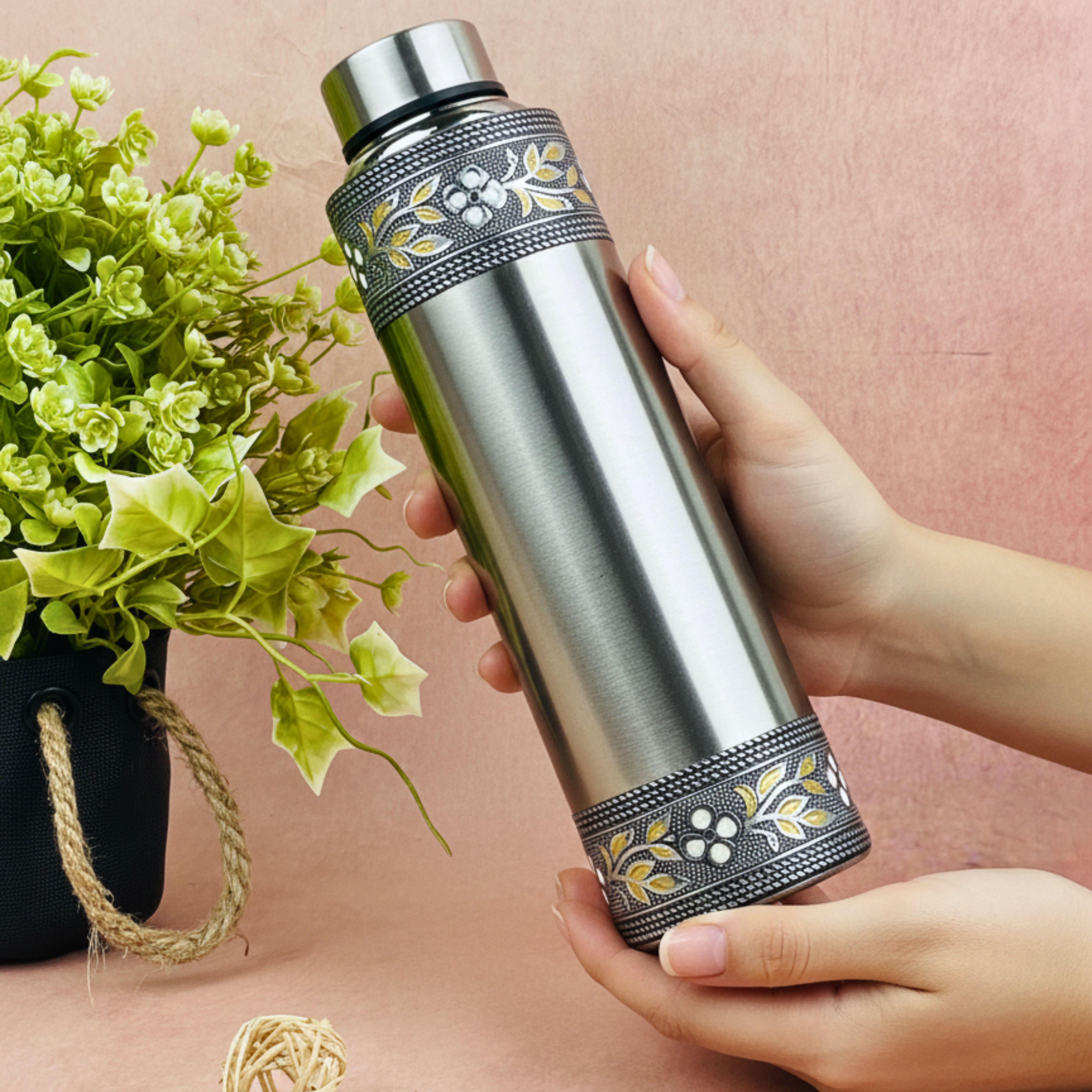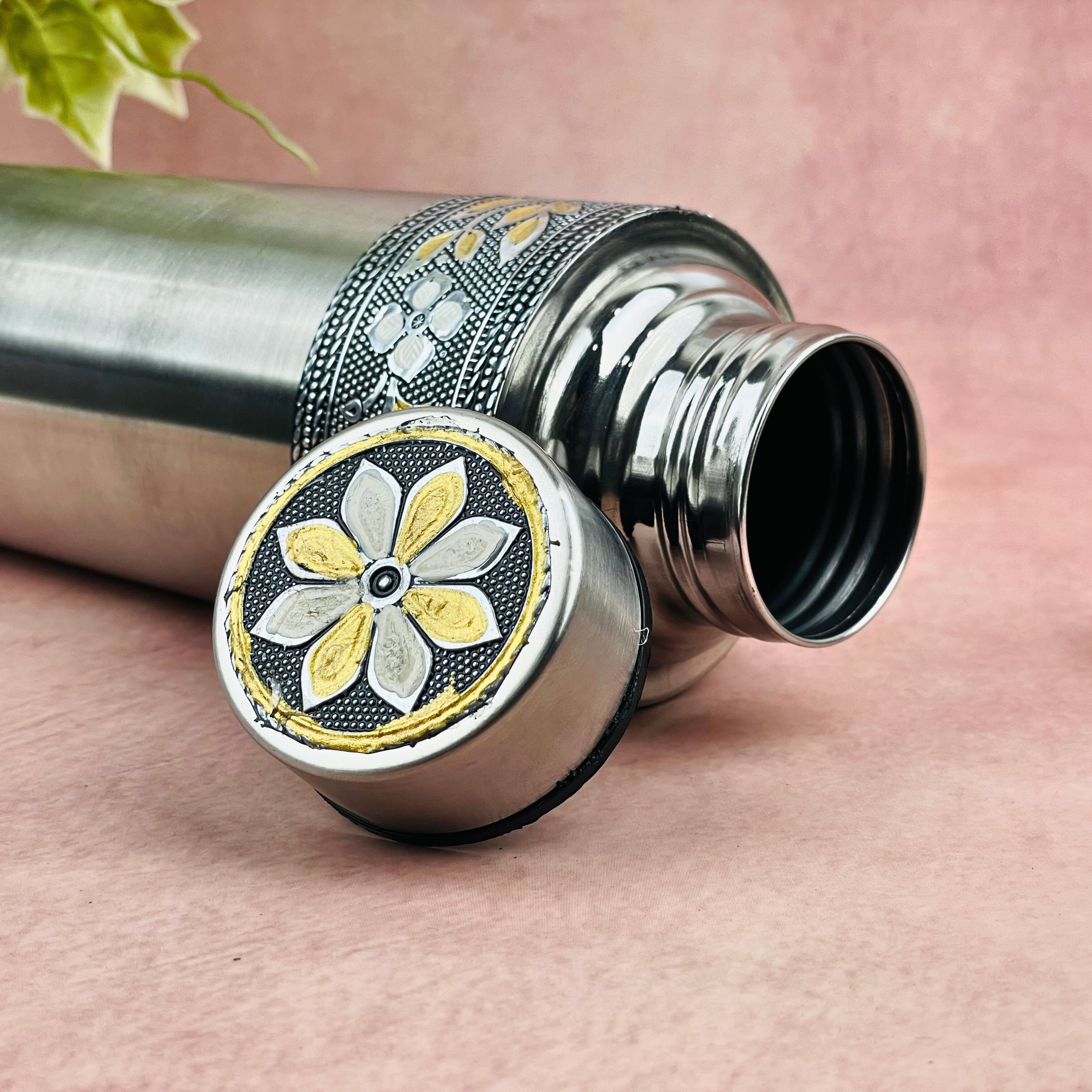 Description: Bring a touch of traditional craftsmanship into your everyday routine with this beautifully designed Meenakari Stainless Steel Water Bottle. Made from high-grade rust-resistant steel, it features an oxidized floral pattern that adds cultural charm while ensuring durability. Lightweight, leak-proof, and easy to carry, this bottle is ideal for office use, home hydration, school bags, gifting, and festive return gifts. The tight-seal cap prevents spills, making it suitable for travel and daily use. Whether used at home, in the kitchen, on the dining table, or as a thoughtful present during weddings, poojas, Navratri, Diwali, Haldi ceremonies, or corporate events, this traditional Meenakari steel bottle stands out as a unique and functional utility gift.