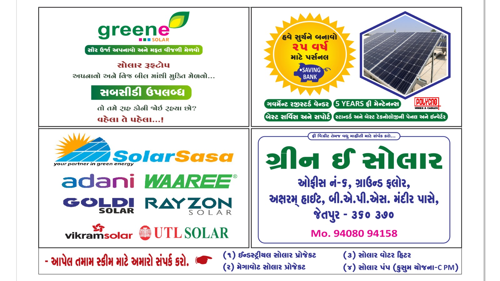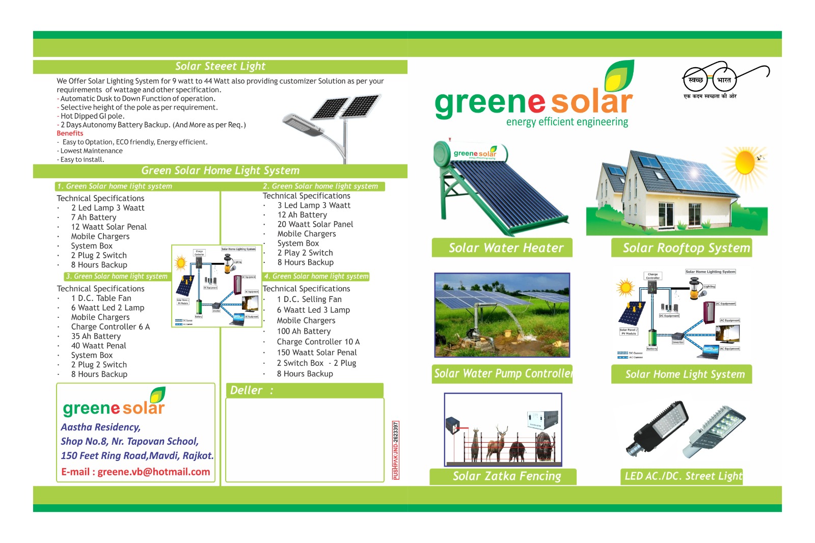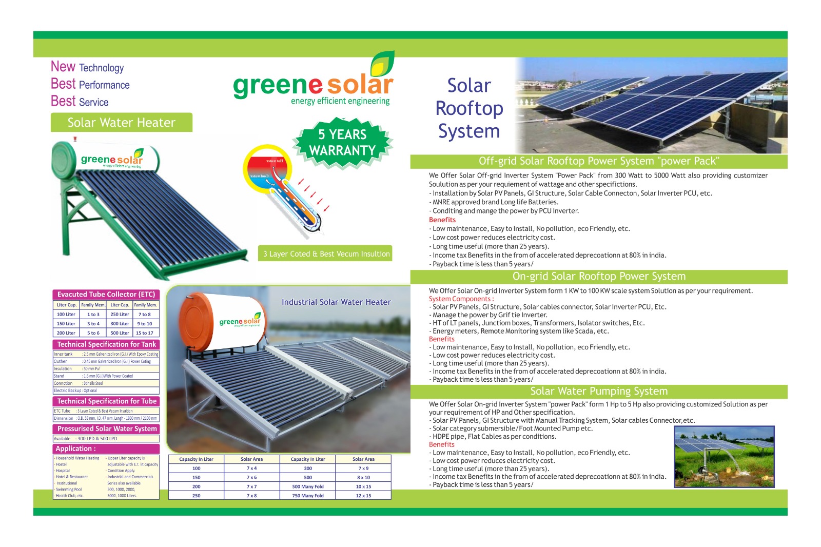 Description: Greene is into manufacturing and supplying of solar photovoltaic & thermal energy application equipments like Solar water Heater, Solar Pumping System, Solar Rooftop Off grid Inverter System-Solar Power Pack, Solar On-grid Inverter System Solar Street Lighting System, Solar Home Lighting System, etc.