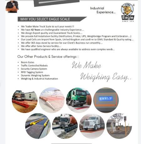 Description: Manufacturing Works is one of the leading manufacturers, repairers of weigh-bridges & well known for special jobs, Turnkey projects, famous for maintaining, Govt. projects, concern of our trade. We have repairing & dealer license from weights & measurements department approved by state central Govt. Dept. please visit our company website :- https://weighbridgeindia.com/