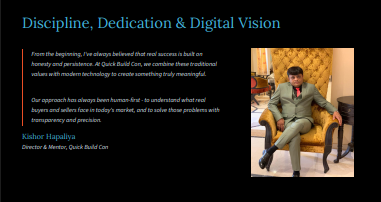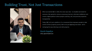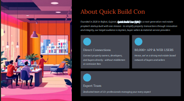 Description: Founded in 2020 in Rajkot, Gujarat, Quick Build Con (QBC) is a next-generation real estate proptech startup built with one mission - to simplify property transactions through innovation and integrity, our target audience is laymen, buyer-sellers & material-service providers.